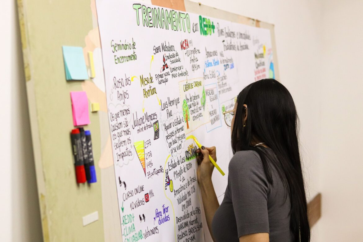 No segundo dia de seminário, as pessoas participantes se engajaram na criação de um Mapa de Ação, utilizando a metodologia de cartografia social. Em grupos, foram identificadas ações necessárias para implementar o REDD+ em seus territórios, considerando recursos disponíveis, desafios e potenciais parceiros. Cada grupo desenvolveu um mapa visual que representou suas propostas e reflexões, apresentada em uma plenária final, promovendo a troca de experiências e colaboração.